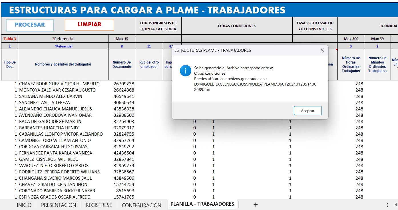 Estructura para cargar a PLAME mediante macros en excel